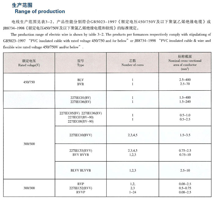 本產(chǎn)品適用于交流額定電壓450/750V及以下的家用電器、小型電動(dòng)工具、儀器儀表及動(dòng)力照明置電源連接,其型號、名稱及使用范圍見表3-1。電線的工作溫度除BV-90、RV-90為90℃外,其余均為70℃。